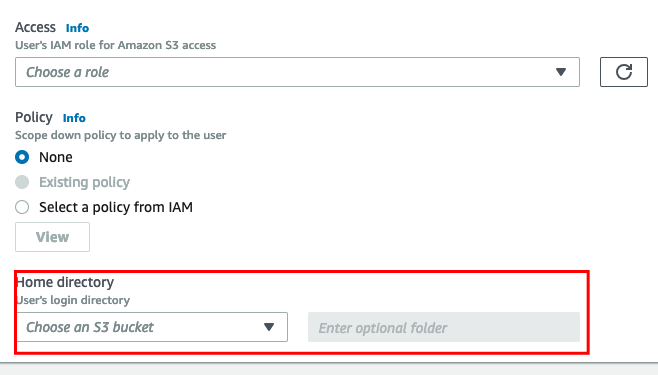 - Home Directory of the SFTP user – This is an S3 bucket with an optional folder