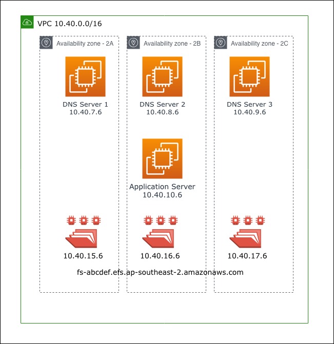 - Given that the Primary DNS server lives in AZ-A, the VPC Provided DNS (10.40.0.2) will always return the ip address of the file system target located in AZ-A